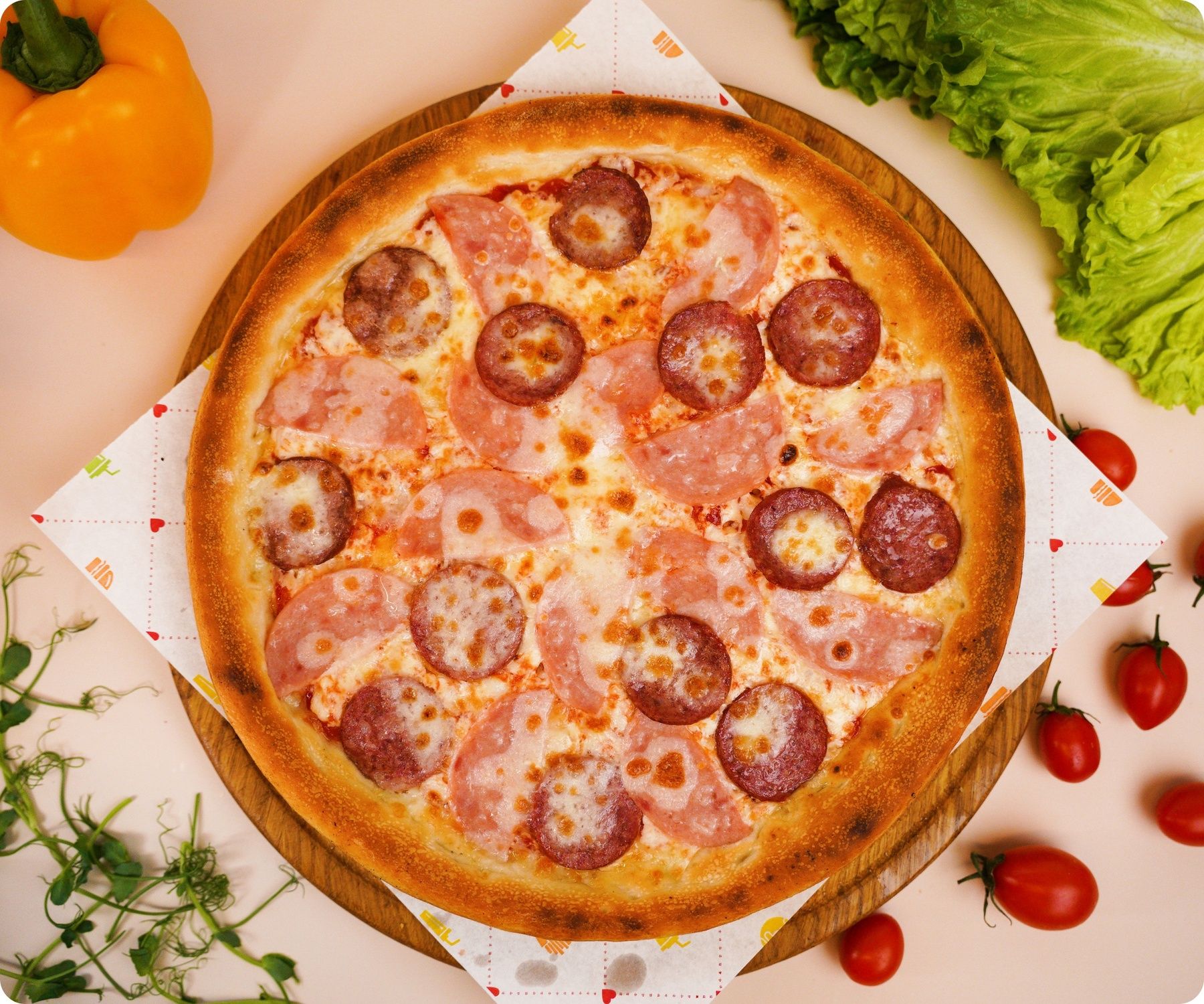Пицца с пикантным вкусом и ароматом. Вкус колбасы, ветчины и томатного соуса идеально сочетаются с нежным сыром моцарелла, создавая неповторимый вкус.
