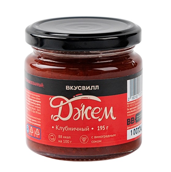 клубника быстрозамороженная, сок виноградный концентрированный, загуститель-пектины (яблочный), регулятор кислотности-лимонная кислота. Продукция производится на предприятии, где используются аллергены: горчица, молоко (лактоза), орехи, сельдерей, соя